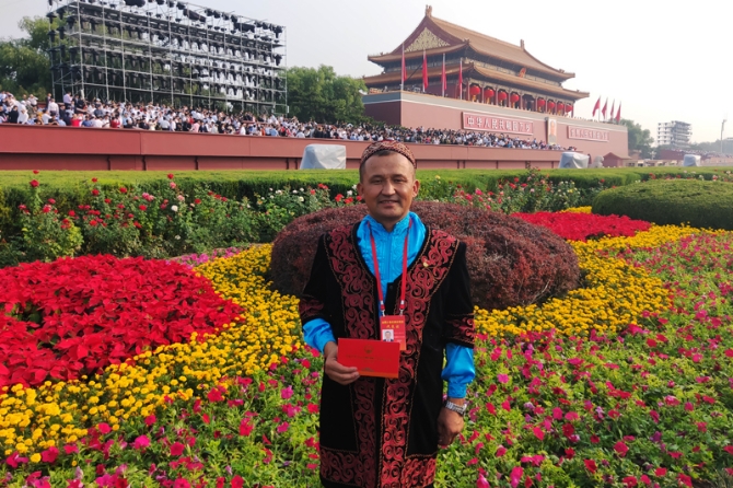 全国民族团结进步模范个人阿曼吐尔·依沙木丁在现场观看阅兵式。图片由本人提供