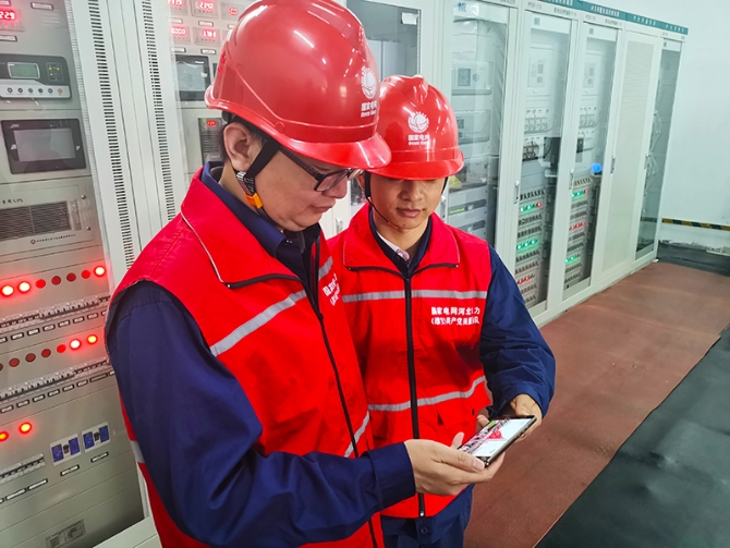 图为国网雄安新区供电公司员工陈洪亮、孙文凯在保电特巡间隙用手机收看国庆70周年庆典。国网雄安新区供电公司供图