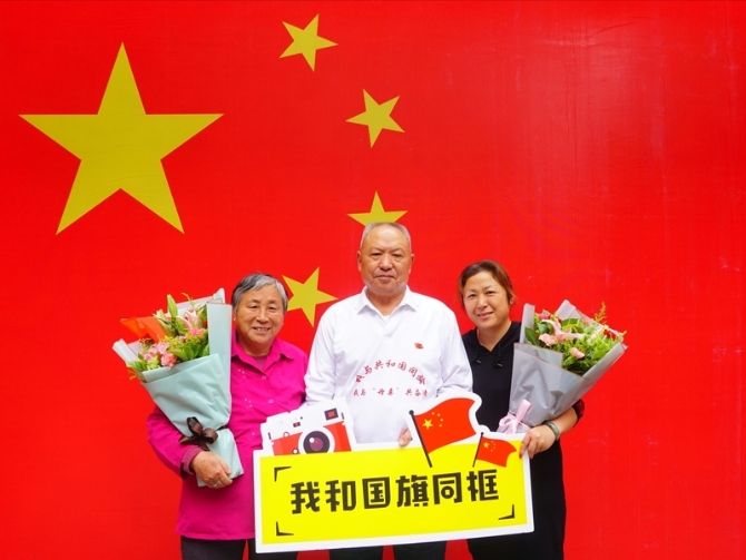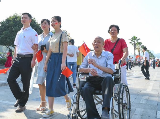 10月1日上午,湖南省娄底市在市委市政府机关大院内举行庄严简朴的升国旗仪式,一位老人在老伴的陪同下,坐着轮椅来参加。图片由娄底市委网信办提供