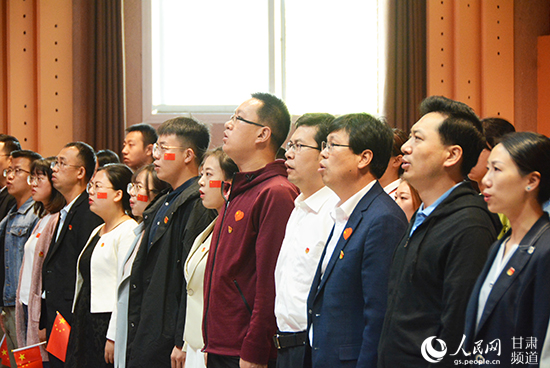 10月1日上午,甘肃省兰州市西北师范大学校园内,西北师范大学团委组织300余名教师以及学生共同观看阅兵式,图为教师及学生起立唱国歌。王文嘉摄