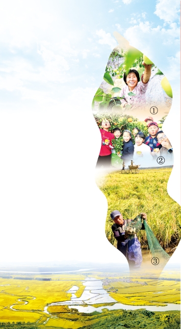 平原地带,凤凰山一峰独秀。从左向右,万亩良田铺陈开来,尽收眼底。天地如椽画笔纵横,良畴沃野,阡陌如绣,绿色、金黄、鹅黄、淡黄……大片大片的稻田,各种色彩交错辉映。滔滔松花江水蜿蜒流过,稻田中的水渠写出了草书“天”字,更远处,群山隐隐。