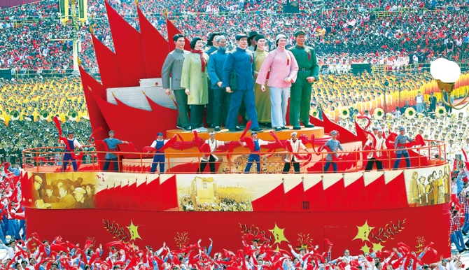 2019年10月1日上午,庆祝中华人民共和国成立70周年大会在北京天安门广场隆重举行。在盛大的阅兵仪式后,是以“同心共筑中国梦”为主题的群众游行。游行分“建国创业”、“改革开放”、“伟大复兴”3个篇章,10万名群众、70组彩车组成36个方阵和3个情境式行进,构成浩大盛世画卷。图为“当家作主”方阵中,彩车的巨型雕塑再现了“人民代表意气风发步出人民大会堂”的经典场景。 视觉中国供图