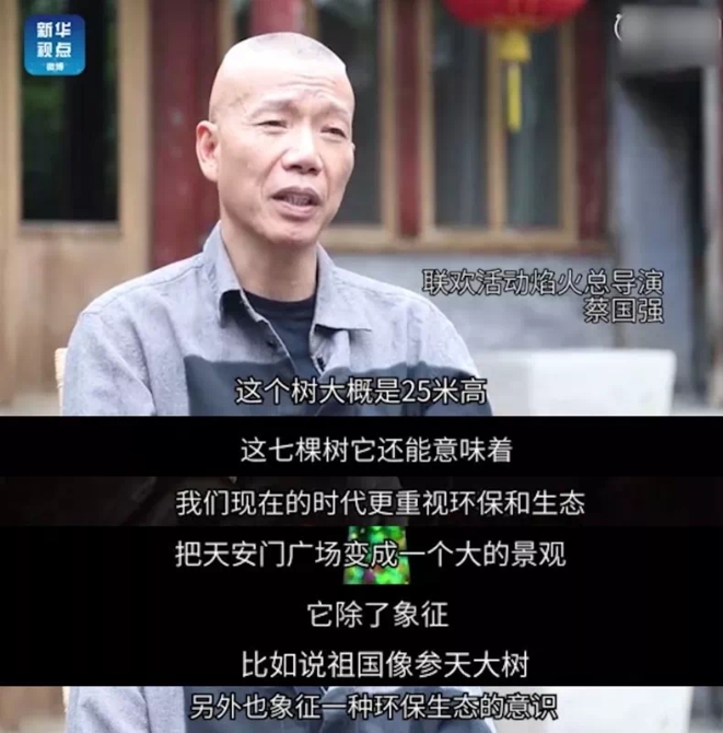 据联欢活动焰火总导演蔡国强介绍,三维动态特效烟花树是焰火表演的一项技术突破。“七棵约25米高、可变幻、多面体的烟花树,象征新中国成立70年来枝繁叶茂、欣欣向荣的巨大成就,也体现生态环保的理念”,而焰火药剂无重金属物质、低硫,均是高科技环保焰火产品。