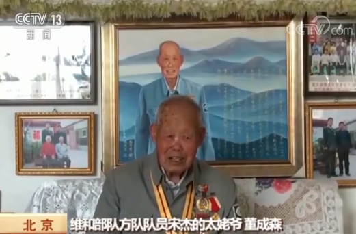 国庆节前几天,维和部队方队受阅战士宋杰的家人,通过部队给他发来了太姥爷董成森的一段视频。