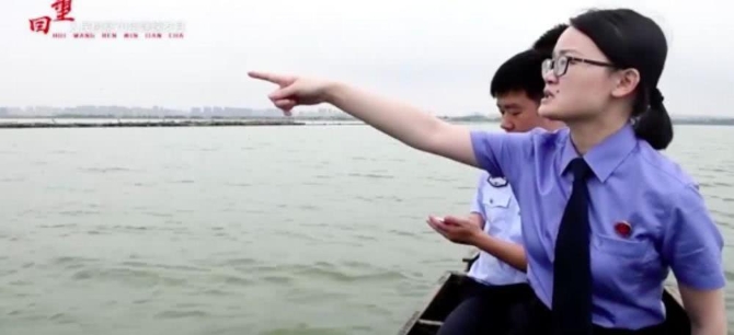 (图:检察官在疑似水污染区域取证,以便提起公益诉讼。)