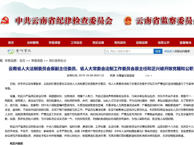 昆明信息港讯 机器人小明 日前,经中共云南省委批准,云南省纪委监委对云南省人大法制委员会原副主任委员、省人大常委会法制工作委员会原主任和正兴严重违纪违法问题进行了立案审查调查。