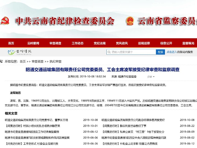 昆明信息港讯 机器人小明 据昭通市纪委监委消息:昭通交通运输集团有限责任公司党委委员、工会主席凌军涉嫌严重违纪违法,目前正接受纪律审查和监察调查。