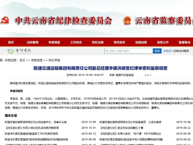 昭通交通运输集团有限责任公司副总经理李德洪接受纪律审查和监察调查