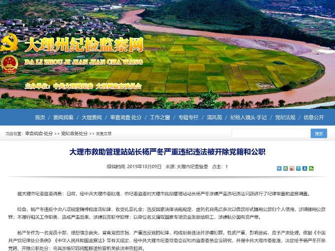 大理市救助管理站站长杨严冬严重违纪违法被开除党籍和公职