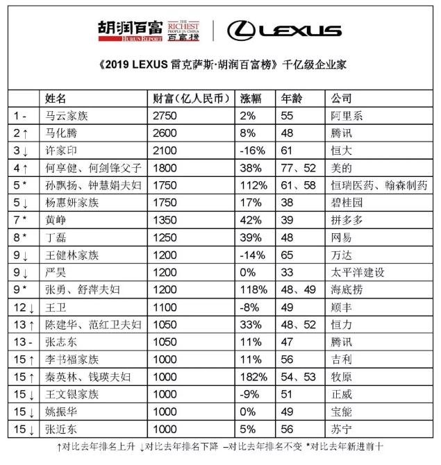 这份榜单中,19人财富上千亿,比去年骤增7人,为历年最多。财富上千亿的企业家中,居住在广东的最多,有7位;其次是浙江和江苏,分别有3位;再次是上海,有2位。