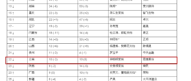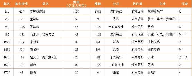 在今天发布的《2019 LEXUS雷克 萨斯·胡润百富榜》名单中,云南有9人上榜。其中,来自云南玉溪的李晓明家族(恩捷股份)以130亿元人民币财富排在291名,成为2019胡润百富榜的云南首富。