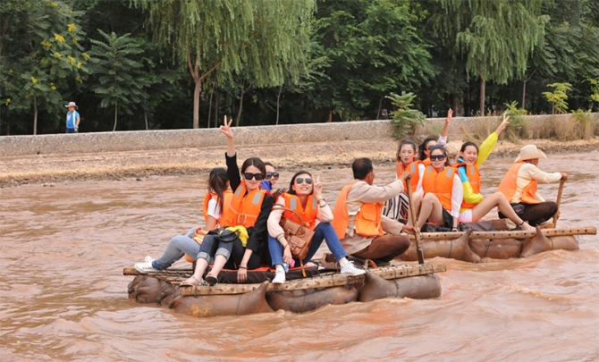 景区门口,有两个大水车。黄河水车,咿咿呀呀响了不知道多少年。如今不再咿咿呀呀,成了景观的一部分。每周,水车前都有各种演出,供游客娱目乐耳。