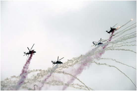 “风雷”飞行表演队派出多达17架直升机参加表演,