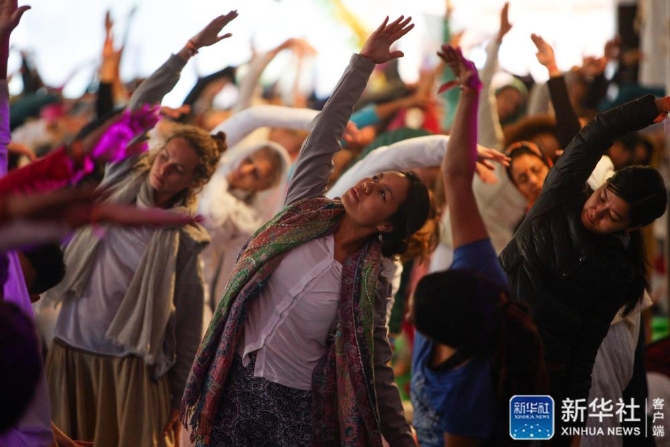 ↑这是来自世界各地的瑜伽练习者在印度北阿肯德邦里希盖什举行的第16届国际瑜伽节开幕式上做瑜伽动作(2015年3月1日摄)。新华社记者 郑焕松 摄
