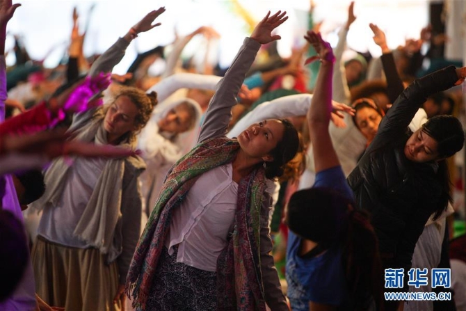 这是来自世界各地的瑜伽练习者在印度北阿肯德邦里希盖什举行的第16届国际瑜伽节开幕式上做瑜伽动作(2015年3月1日摄)。新华社记者 郑焕松/摄