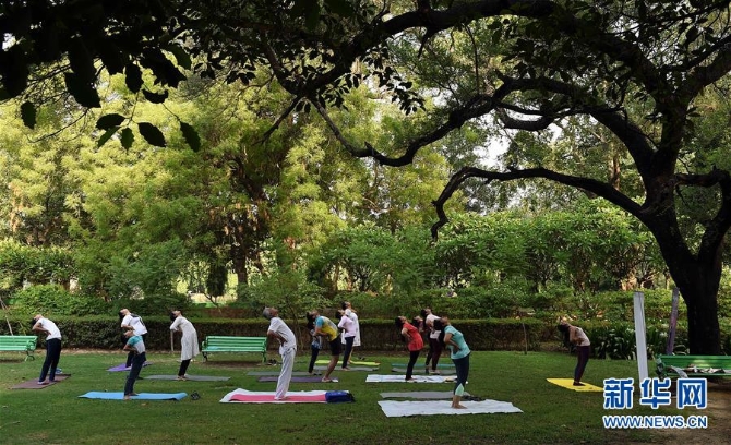 这是在印度新德里,人们在公园练习瑜伽(2019年6月21日摄)。 新华社记者 张迺杰/摄