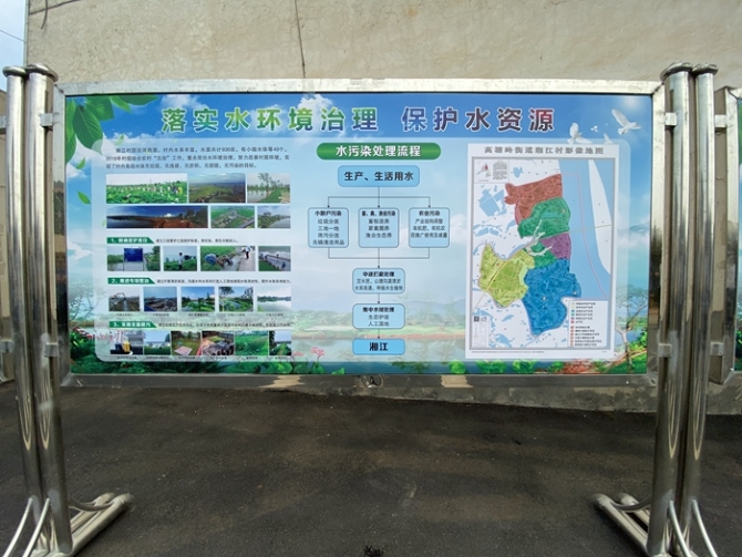 图为长沙市望城区高塘岭街道湘江村水环境治理宣传板。新华网 汪亚摄