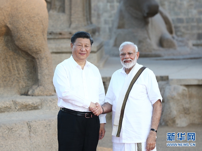 在深邃星空下的海岸神庙,面对着浩瀚无际的印度洋,习近平和莫迪畅谈中印各自国内发展,交流治国理政经验,一致认为,中印要相互尊重、相互学习、相互借鉴,携手实现共同发展繁荣,实现中印两大文明伟大复兴。
