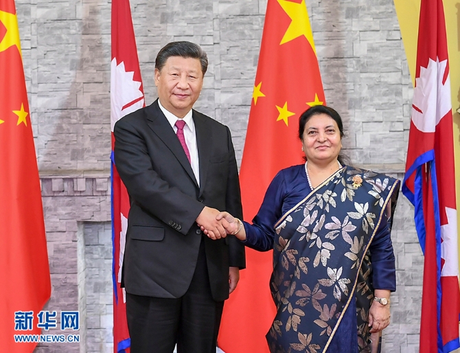 习近平指出,今年4月在北京,你盛情邀请我年内访问尼泊尔。我今天如约而来。正如总统女士所说,中尼之间只有友好和合作。在机场和沿途欢迎人群的脸上,我看到了尼泊尔人民真诚的笑容,感受到了他们对中国人民发自内心的友好,让我再次感受到中尼友好在尼泊尔拥有广泛共识和扎实根基。中尼两国人民心意相通、休戚与共,是邻国友好交往的典范。我希望通过这次访问,传承中尼传统友谊,顺应两国人民期待,推动两国关系更上一层楼。