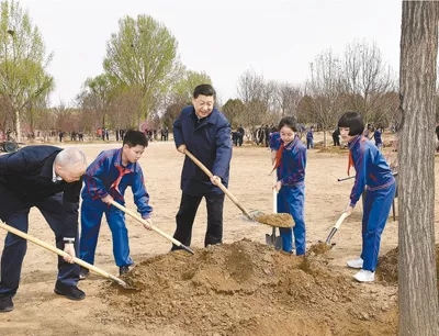 2019年4月,习近平总书记来到北京城市副中心绿心城市森林公园参加首都义务植树活动。他一边劳动,一边向身边的少先队员询问学习生活和体育锻炼情况,祝他们像小树苗一样茁壮成长。