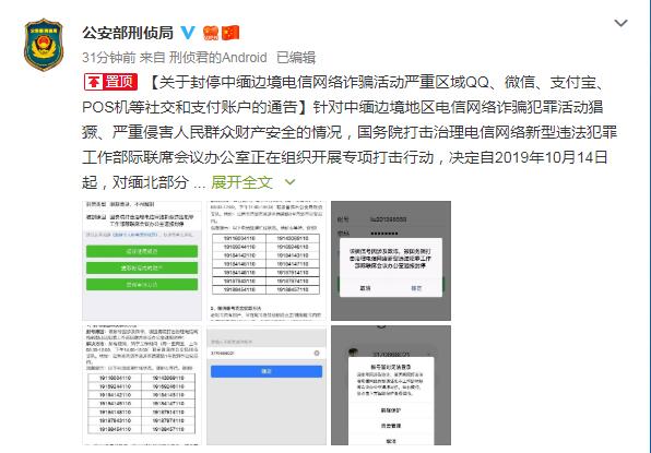 昆明信息港讯 10月15日下午,公安部刑事侦查局官方微博“公安部刑侦局”发布微博,对缅北部分电信网络诈骗活动严重区域的QQ、微信、支付宝、POS机等社交和支付账户封停一事进行了通告。通告全文如下: