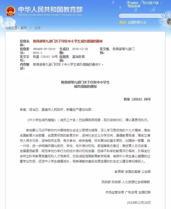 教育一直是大家关心的重点话题,中小学生减负这个问题已是个老生常谈的话题了。2018年12月底,教育部、国家发展改革委、公安部等九部门联合印发《中小学生减负措施》。