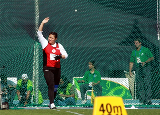2011年7月22日,中国队选手张文秀在比赛中投掷完最后一轮链球后向观众挥手致意。当日,第五届世界军人运动会田径赛场迎来第二轮夺金潮,中国女子链球名将张文秀发挥出色,以74米29的成绩摘得金牌,同时打破了由她本人创造的赛会纪录。这也是我国选手在本届世军会田径赛场上获得的首枚金牌。新华社记者 张泳 摄