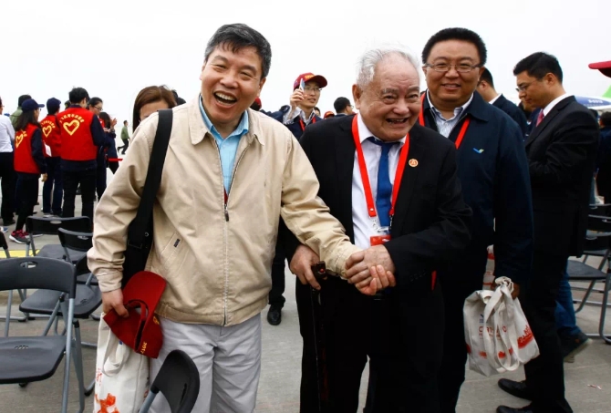 2017年5月5日,“运十”飞机的副总设计师程不时(中)在C919首飞现场。