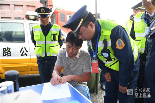 “我们执法队有10人,采取两班倒的方式进行24小时值守严查,每一班执法人员连续执法12小时,对收费站入口的所有货车都进行检查,发现超载车辆都将称重,按规定监督其卸载超重货物,待称重后符合标准才给予放行。”昆明市公路路政管理支队一大队中队长代勇介绍,货物卸载完成之后,交由交警处理,一般超重30%以下的记3分,超重30%以上的记6分,并依法进行罚款。“自从开展联合执法整治大货车超载以来,我们执法队累计检查大货车460余辆次,查获超载大货车110辆次,目前,海口高速公路入口‘百吨王’货车流量下降明显。”代勇介绍。