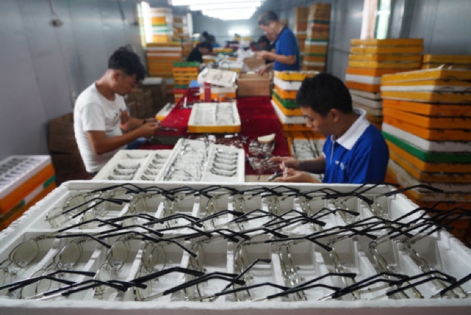 在江西省鹰潭市余江区平定乡东脑村世宏光学扶贫车间,村民在加工一批眼镜产品(10月12日摄)。近年来,江西省鹰潭市结合产业特点,引导当地生产实体“下沉”到村组,让贫困群众在家门口就能实现就业脱贫。据了解,全市已建成运营“产业下沉”结业扶贫车间88个,吸纳就业2000余人。新华社记者万象/摄