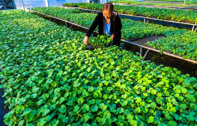 9月27日,河北省衡水市武邑县兴彪蔬菜种植专业合作社农民在育苗大棚内打理秧苗。近年来,河北省衡水市武邑县在脱贫攻坚中依托区域蔬菜瓜果生产,大力推广蔬菜集约化育苗技术,全县已建成年育苗能力1000万株以上的集约化育苗基地5家,农民可根据种植需求与基地签订30余种蔬菜种苗的育苗合同。目前,该县年培育优质瓜菜秧苗近1亿株,集约化育苗率达90%以上,带动当地农民实现增收。新华社记者李晓果/摄