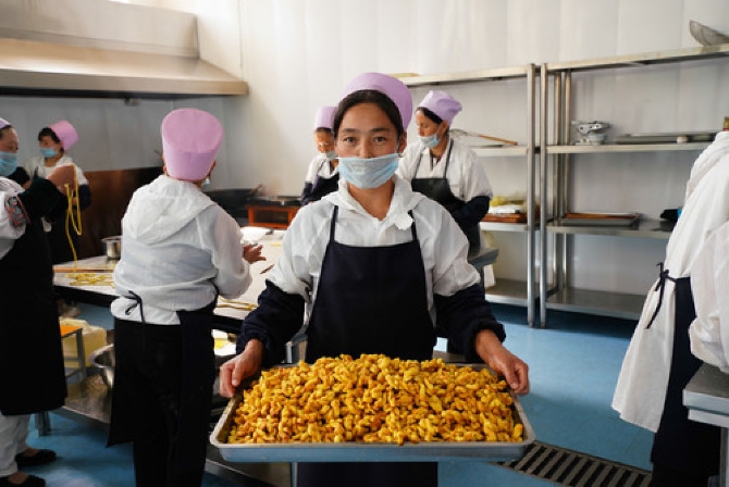 在甘肃省临夏回族自治州东乡族自治县高山乡布楞沟村一扶贫基地,赵阿英社展示她制作的特色面食——花馃馃(8月29日摄)。 34岁的赵阿英社在这家加工特色面食“花馃馃”的扶贫基地工作一年多了,每月有2000元的收入。布楞沟村在东乡语中意为“悬崖边”。如今,这个深贫村有了连通全村的脱贫路,扶贫车间、扶贫基地纷纷出现,很多农村妇女从田头进入车间。新华社记者陈君清/摄