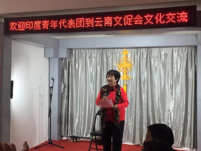 当天,在昆明市盘龙区合虚民族民间文化传馆,中华文化促进会副主席、云南省中华文化促进会主席秦桂珍对印度青年代表团一行致以热烈欢迎。她在致辞中谈到,在云南省人民政府外事办公室,原云南省文化厅、我国驻加尔各答总领馆等部门的高度重视和大力支持下,云南省中华文化促进会自2014年以来先后五次成功的访问了加尔各答,为加尔各答的民众送去了“异彩纷呈的中国歌舞”、“一带一路”云南剪纸艺术展,呈现了中国京剧、滇剧、民族歌舞、杂技、魔术、柔术。今年7月还在昆明接待了印度加尔各答知名女性代表团。这些人文交流活动增进了感情,促进了双方的沟通,希望在大家的共同努力下,用实际行动浇灌更加绚丽的友谊之花。