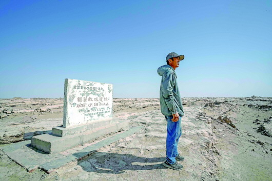 楼兰文物保护站工作人员麦麦提江·麦麦提明在楼兰古城遗迹前巡查(8月13日摄)。(记者赵戈摄)