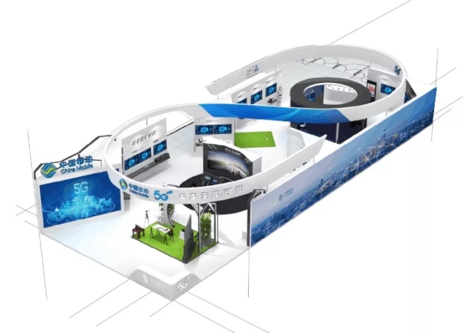 造型独特的中国移动展区以“∞”型的设计,象征着5G看移动,未来无限可能!