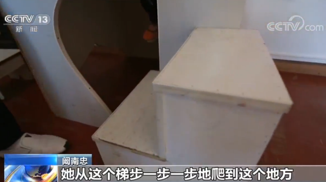 阚南忠:她这个桌子和一般的小孩的桌子是一样的,她的坐凳就不一样了。她的坐凳是专门我给她设计的,她从这个梯步一步一步地爬到这个地方,才能坐到像正常孩子坐得一样。我不可能把这个桌子做得很矮,像这样才是正常小孩坐的这个桌子,她就通过这个凳子一步一步地上去,一步一步地下来,这样她的学习就方便了。