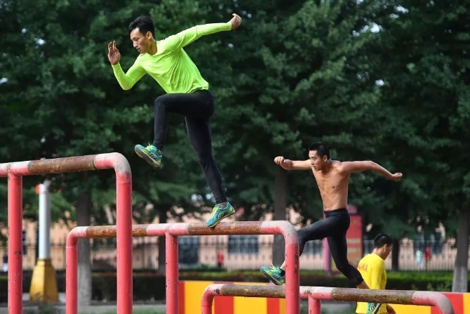 八一军事五项队男队员在进行500米障碍跑训练。