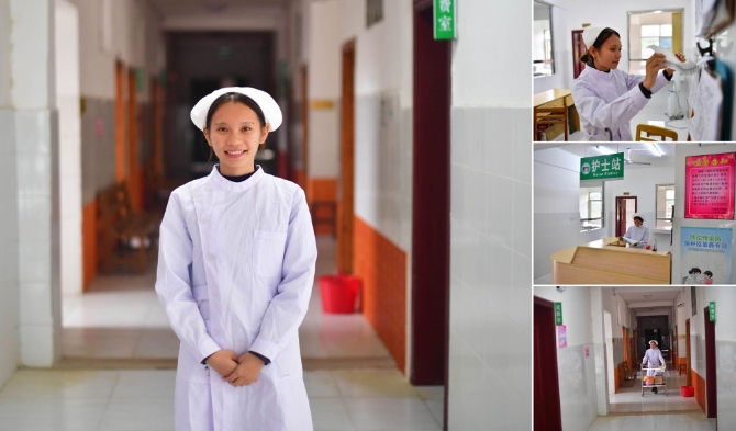 拼版照片:左图为广西融安县大坡乡卫生院19岁的护士廖甜甜;右图为廖甜甜在卫生院工作(照片均摄于10月23日)。今年8月份,廖甜甜从卫校毕业后到卫生院工作,2000年8月出生的她目前是卫生院唯一的“00”后。
