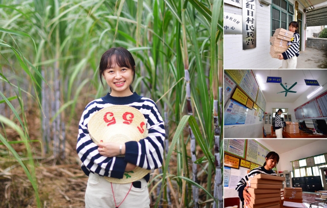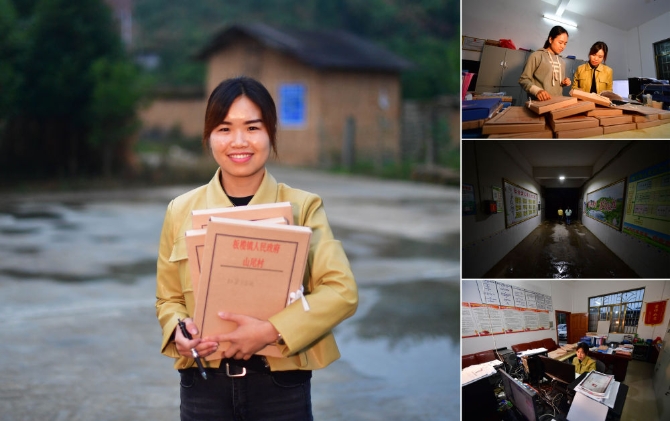 拼版照片:左图为广西融安县板榄镇副镇长、27岁的韦宇琪;右上图为韦宇琪(右)在板榄镇山尾村工作;右中图为韦宇琪加班后走出办公楼和同事一起去吃晚饭;右下图为韦宇琪在板榄镇山尾村工作(照片均摄于10月22日)。韦宇琪毕业后到政府部门工作已有5年,多次被派到农村担任扶贫工作队员,基层工作经验丰富。今年3月份,韦宇琪到板榄镇担任副镇长。