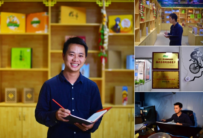 拼版照片:左图为广西融安蚂蚁农业发展有限公司29岁的总经理陈天安;右上图为陈天安在公司工作;右中图为公司一景;右下图为陈天安在公司工作(照片均摄于10月22日)。出身贫困家庭的陈天安父母都是残疾人。2016年,陈天安和几个同学回到融安创业,利用电商平台推介融安金桔等特色水果,并带动贫困户脱贫。