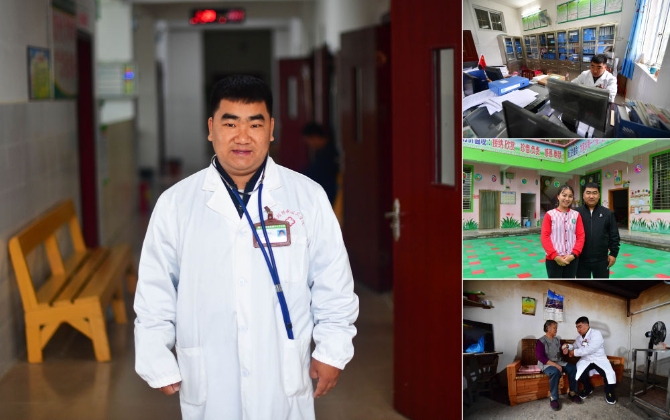 拼版照片:左图为广西融安县板榄镇29岁的医生杨志县;右上图为杨志县在卫生院办公室工作;右中图为杨志县和21岁的女友杨枚柳在一起;右下图为杨志县到农户家中为老人看病(照片均摄于10月23日)。杨志县和杨枚柳的家乡是邻县的广西融水苗族自治县拱洞乡,杨志县在融安县板榄镇工作已有7年,女友杨枚柳今年毕业后选择到杨志县工作的贫困山区工作,是板榄镇成林幼儿园的老师。