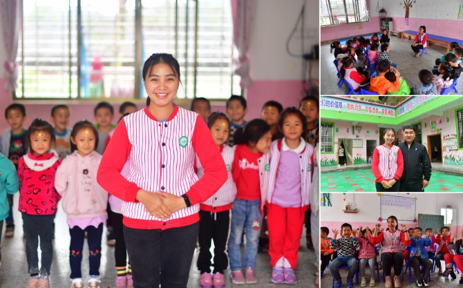 拼版照片:左图为广西融安县板榄镇成林幼儿园21岁的老师杨枚柳;右上图为杨枚柳和小朋友在课堂上;右中图为杨枚柳和29岁的男友杨志县在一起;右下图为杨枚柳和小朋友在课堂上(照片均摄于10月23日)。杨枚柳和男友杨志县的家乡是邻县的广西融水苗族自治县拱洞乡,杨志县在融安县板榄镇卫生院工作已有7年,杨枚柳今年毕业后选择到男朋友工作的贫困山区工作。