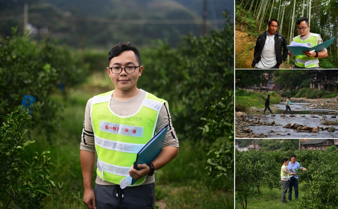 拼版照片:左图为广西融安县板榄镇泗安村27岁的驻村第一书记张清;右图张清在泗安村工作的场景(照片均摄于10月20日)。张清来到泗安村驻村已有1年多,他和同事们带领群众发展金桔、杉木等产业。2018年,泗安村共有100户贫困户实现脱贫。