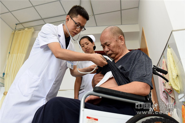 2019年9月7日,南和县中医院医养中心医护人员为老人检查身体。(新华社记者 朱旭东 摄)