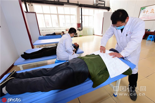 2018年4月10日,山东省潍坊青州市实行“以养融医”模式的安康养老中心的医生为老人们康复按摩。
