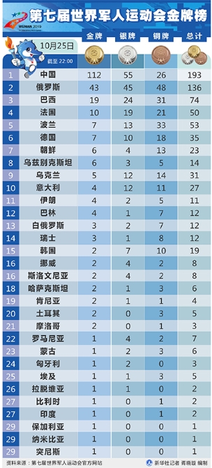 25日比赛结束后,中国军团以112金55银26铜继续位居金牌榜和奖牌榜首位,俄罗斯队以43金45银48铜位居金牌榜和奖牌榜次席,巴西队以19金24银31铜位居金牌榜和奖牌榜第三。