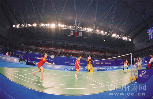 武汉大学大学生体育活动中心,羽毛球女双决赛正在进行。该比赛场地使用的地胶由江苏威克多体育用品有限公司生产,现已用在多个世界级体育赛事中。