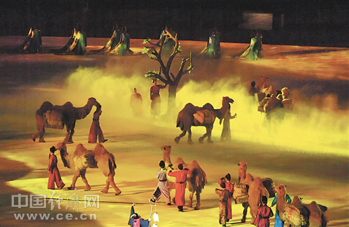 军运会开幕式上,再现丝绸之路上的驼队,将华夏文明传递给世界。