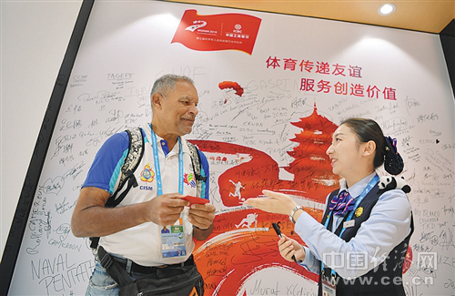 中国工商银行业务员为外宾提供金融服务。针对“村民”多国家、多语言、多军人的特点,工行军运村服务点的建设和服务突出了国际化、智慧化特色。