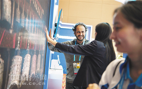在军运会主媒体中心5G传播创新实验室,来自巴西的媒体记者通过5G+AR体验编钟演奏。